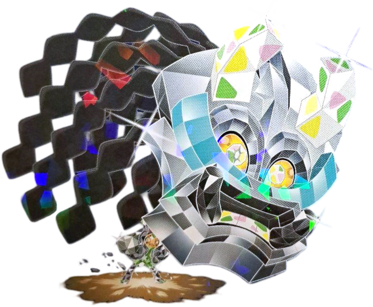 « Sous cette forme, son énergie Téracristal est décuplée et son apparence évoque le monde tel que les êtres humains le concevaient autrefois. Selon un vieux récit d’exploration, lorsqu’il est enfoui profondément dans le sol, ce Pokémon ressemble à une planète flottant dans l’espace. »